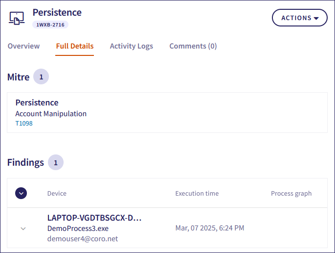 Findings: This section displays additional details about the process that triggered the EDR ticket: