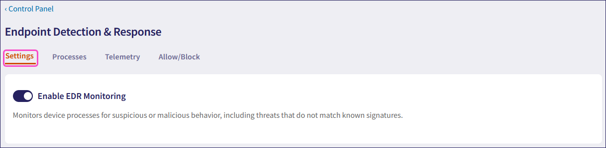 The EDR Settings page allows you to enable or disable Endpoint Detection and Response (EDR) monitoring for your workspace.