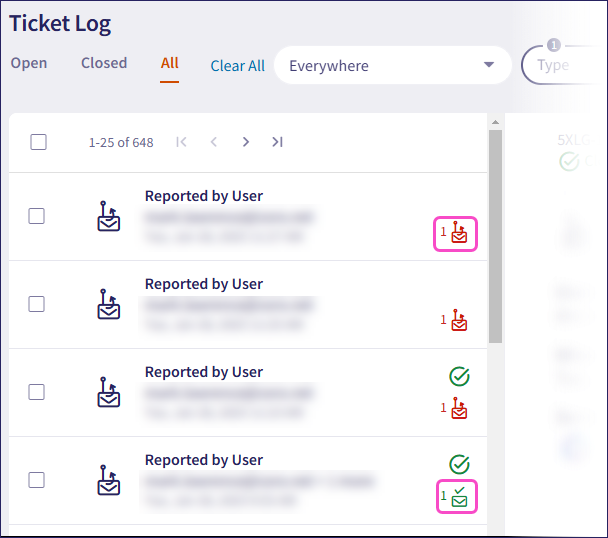 In the Ticket Log, Coro marks tickets affected by a user report with phishing or safe: