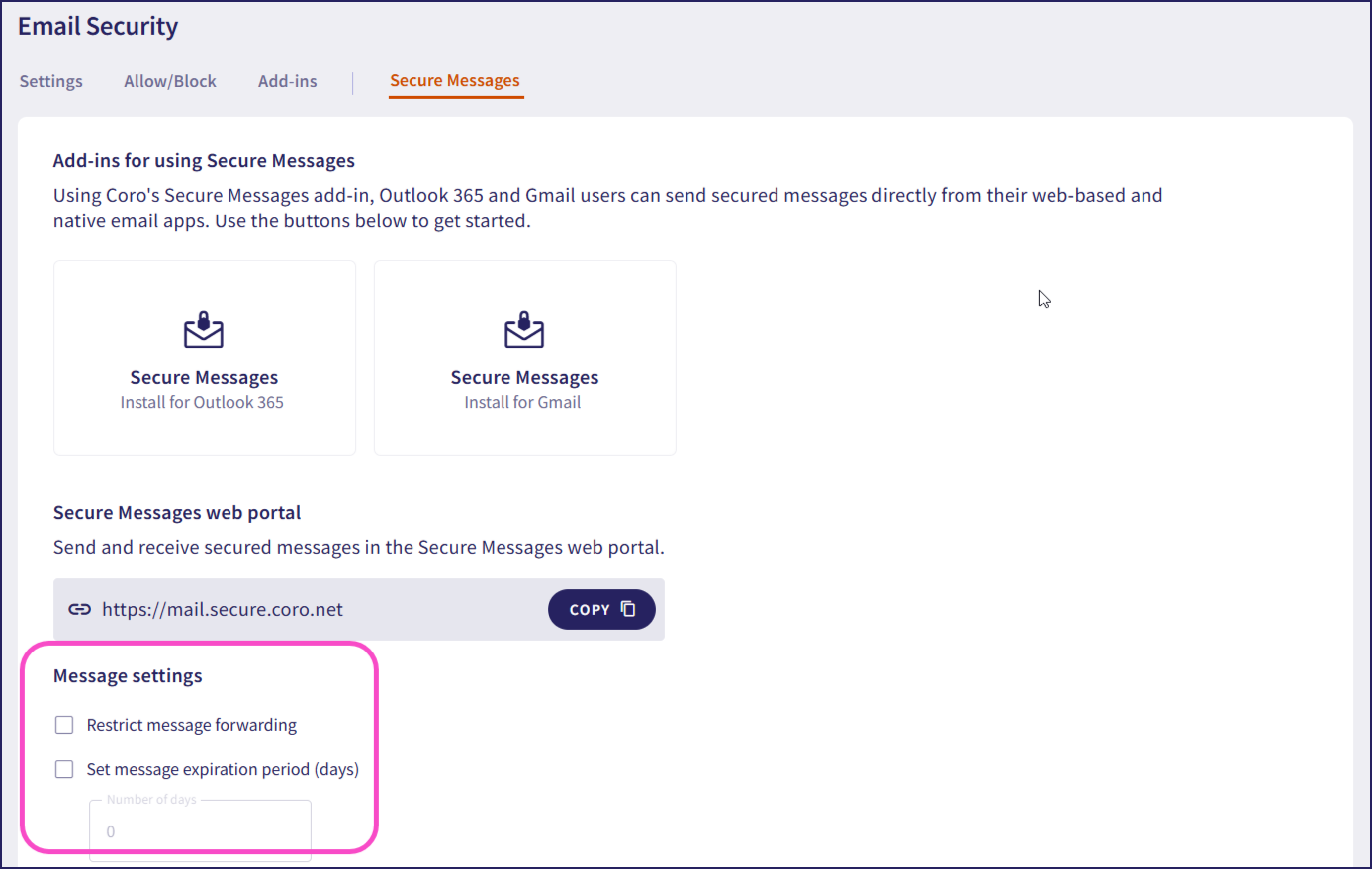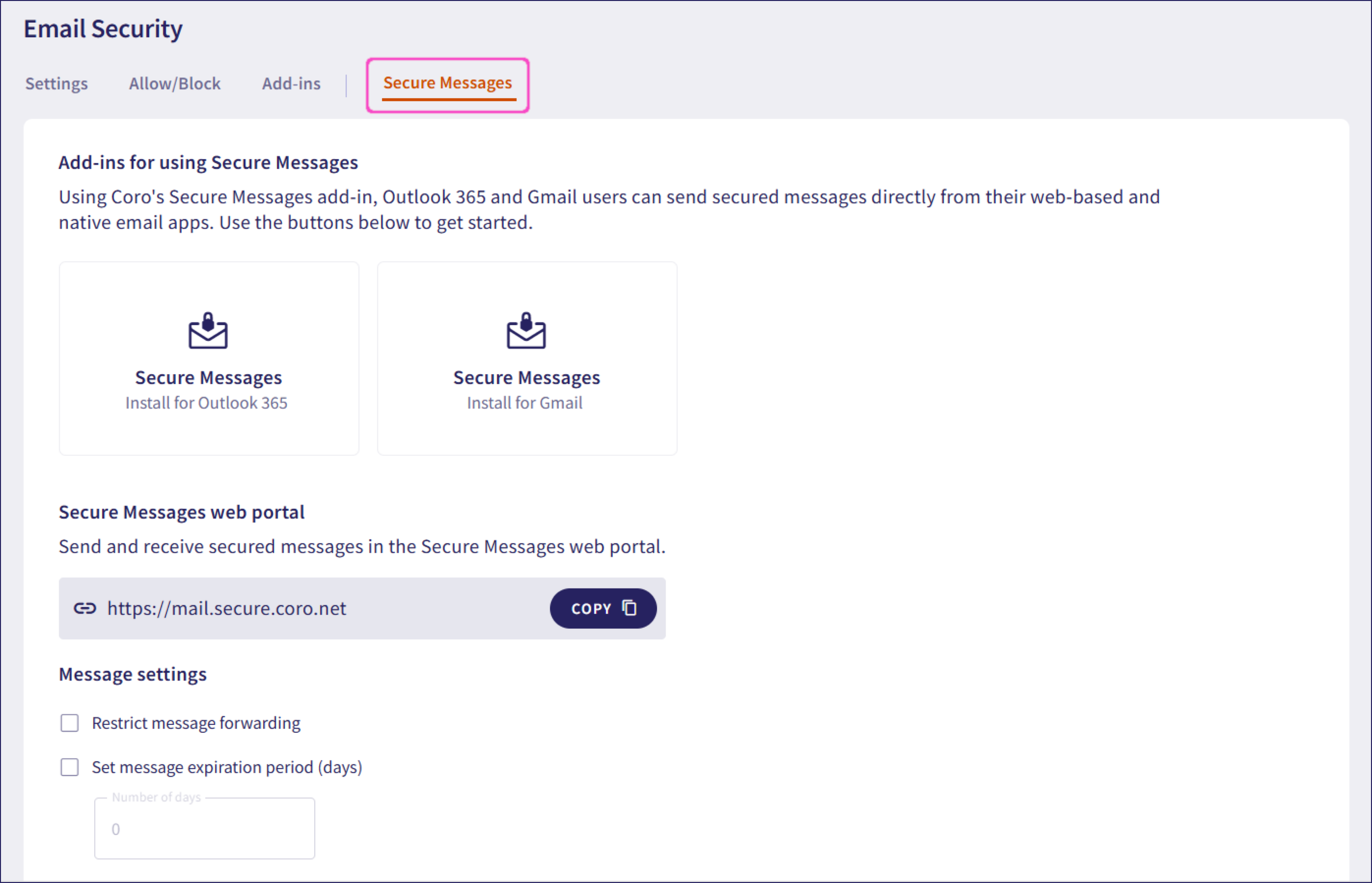 - For the Secure Messages email add-ins, see Secure Messages Outlook add-in or Secure Messages Gmail add-in.