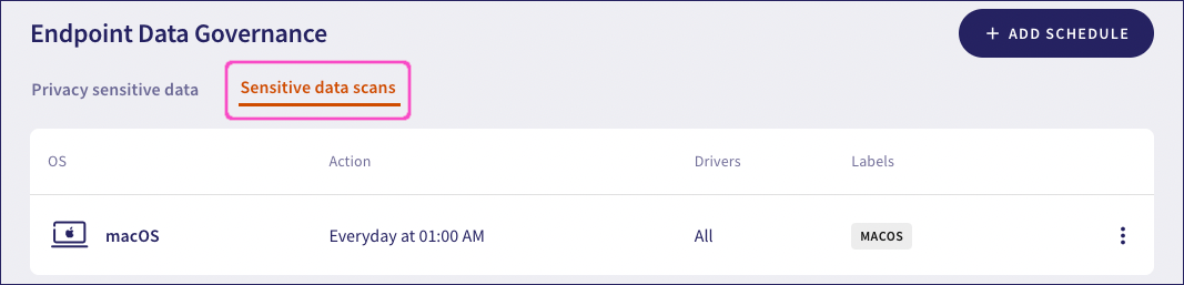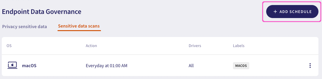 Coro enables you to create scheduled endpoint device sensitive data scans for storage drives on Windows and macOS devices. These scans activate at a specified time and frequency, for example, every Friday at 3 a.m.