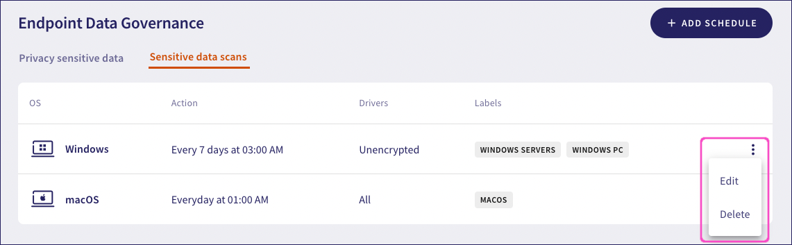 To update or delete a previously created scan schedule, select the three-dot menu adjacent to the schedule you want to change: