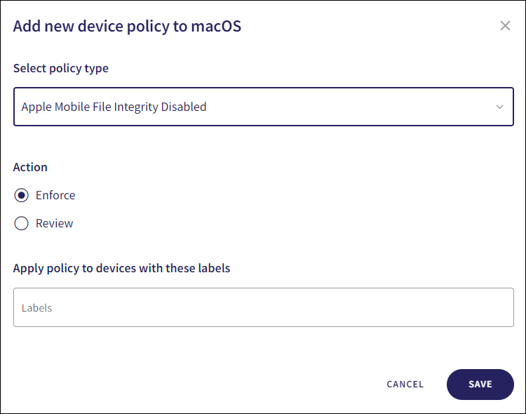 The Apple Mobile File Integrity Disabled device policy is currently supported for macOS devices.