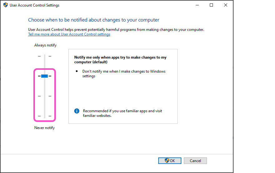 Coro enforces the UAC Notification Missing policy when Windows User Account Control settings are set to: