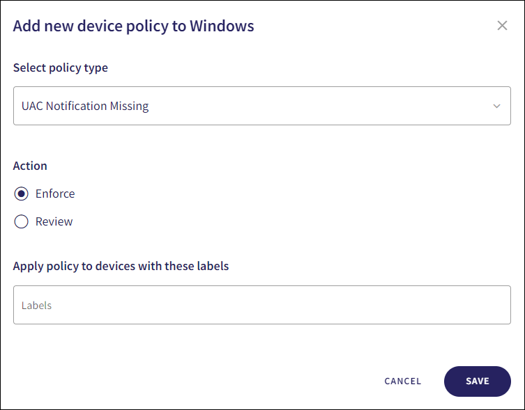 Enter label names (predefined or custom) to the Labels field listed under Apply policy to devices with these labels to apply the new policy to specific groups of devices.