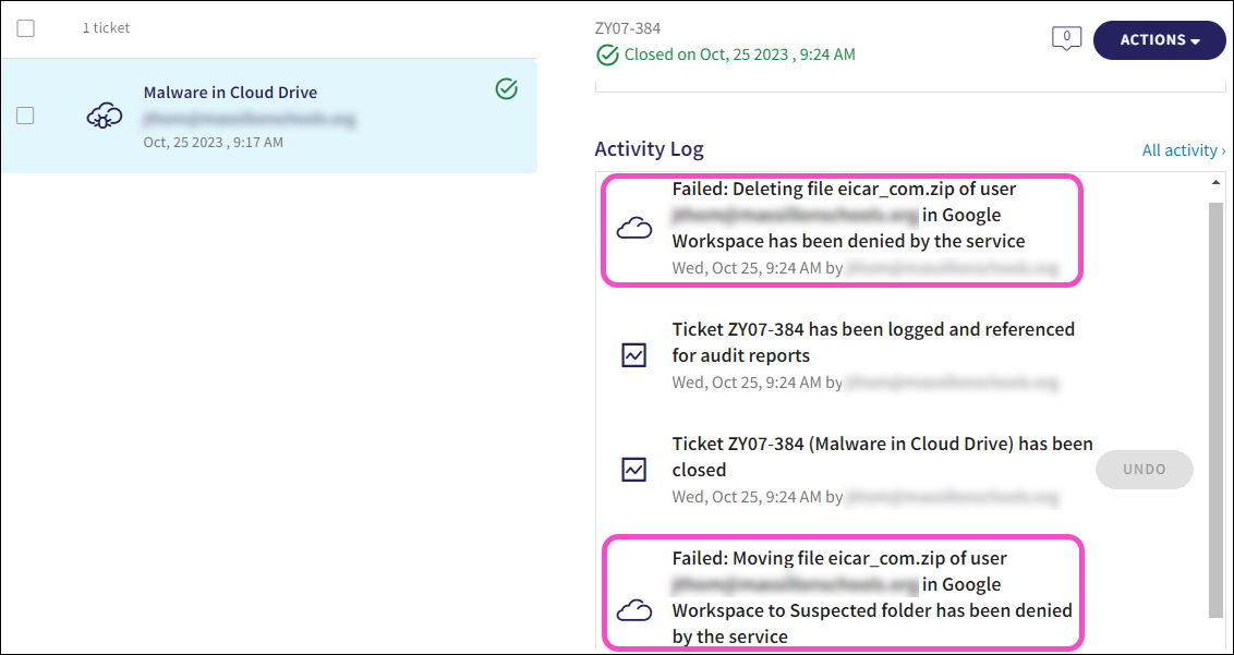 A failed remediation activity within a Malware in Cloud Drive ticket indicates that the file was remediated by the native cloud application.