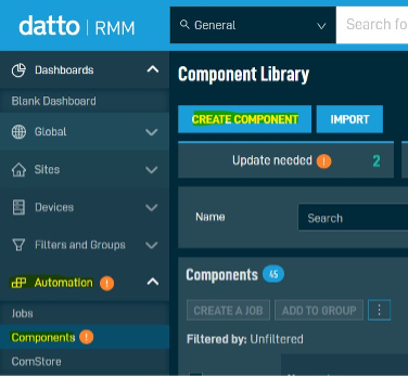 CoroInstaller_[workspace-ID].msi.Access your Datto dashboard, and go to Automation > Components. Select Create component: