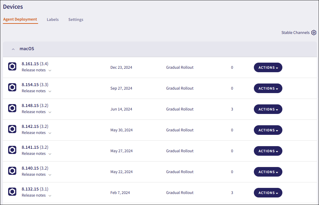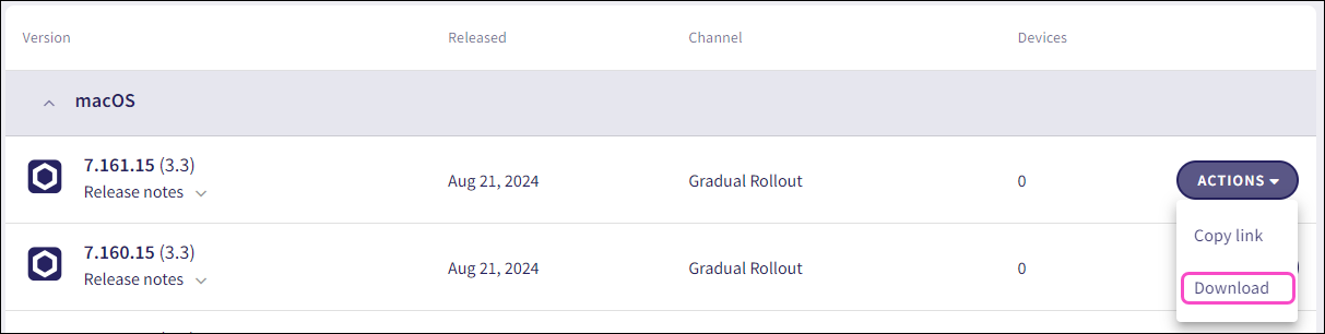 Select Actions > Download adjacent to the desired macOS Agent version: