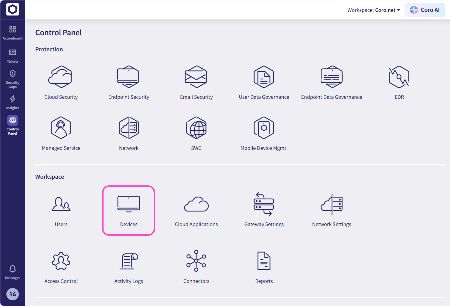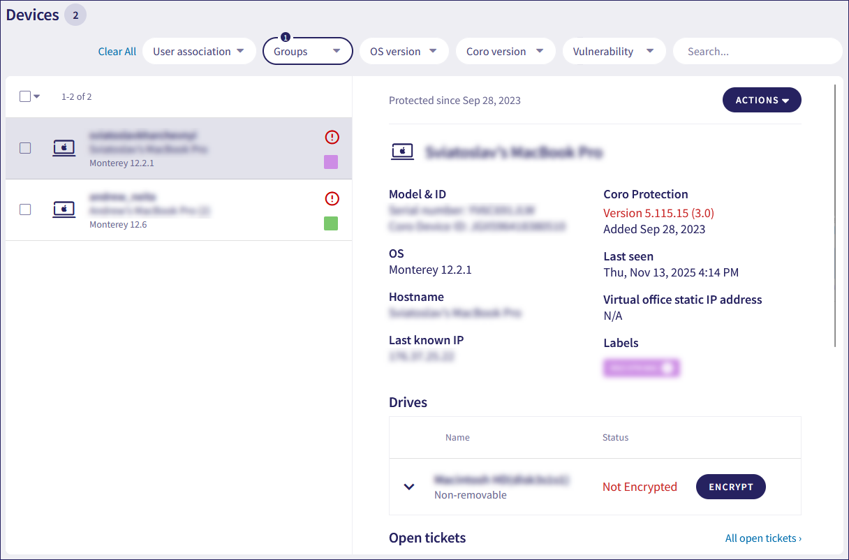 From the Coro console Actionboard, select the Protected Devices panel to view your device: