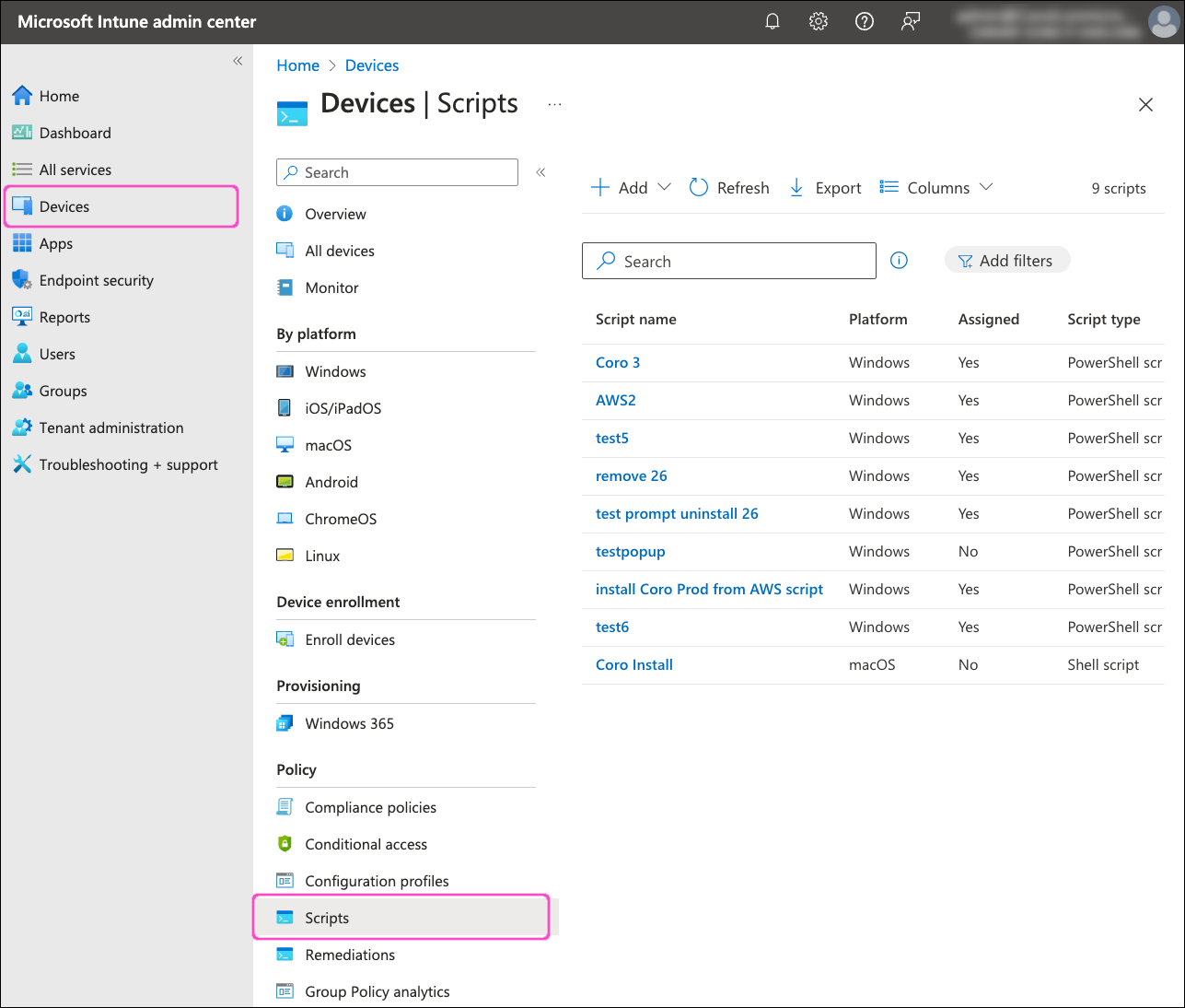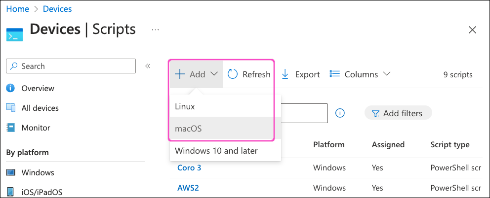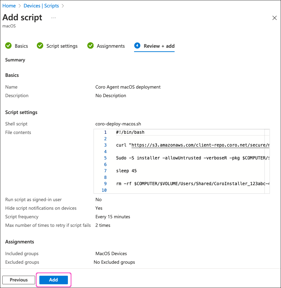 To silently deploy the Coro Agent to macOS devices via Intune, Coro recommends using a shell script rather than the native app deployment process. This is because Coro Agent installer filenames contain activation codes. Microsoft Intune modifies installer filenames during app deployment, causing macOS devices to fail to register with a Coro workspace.