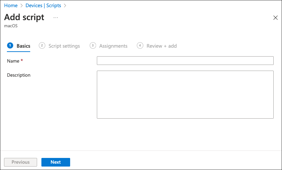 Intune displays the Add script dialog, on the Basics step: