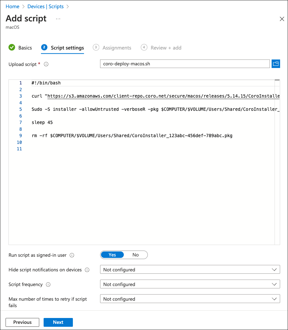 Setting Value Run script as signed-in user No Hide script notifications on devices Yes Script frequency Every 15 minutes Max number of times to retry if script fails 2 times Script frequency and Max number of times to retry if script fails are optional settings. The values provided here are suggested by Coro, but should be adjusted to meet your organization's needs.