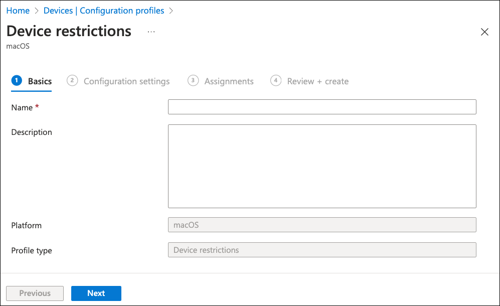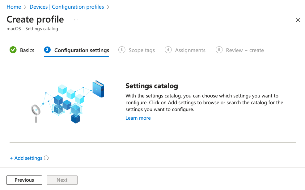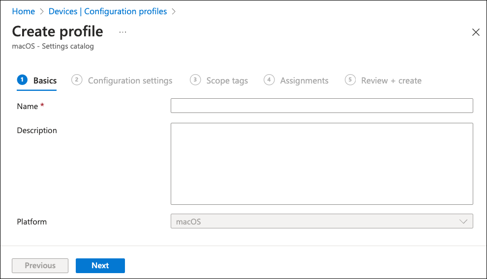 In the Platform dropdown, select macOS. Then, for Profile type, select Settings catalog.