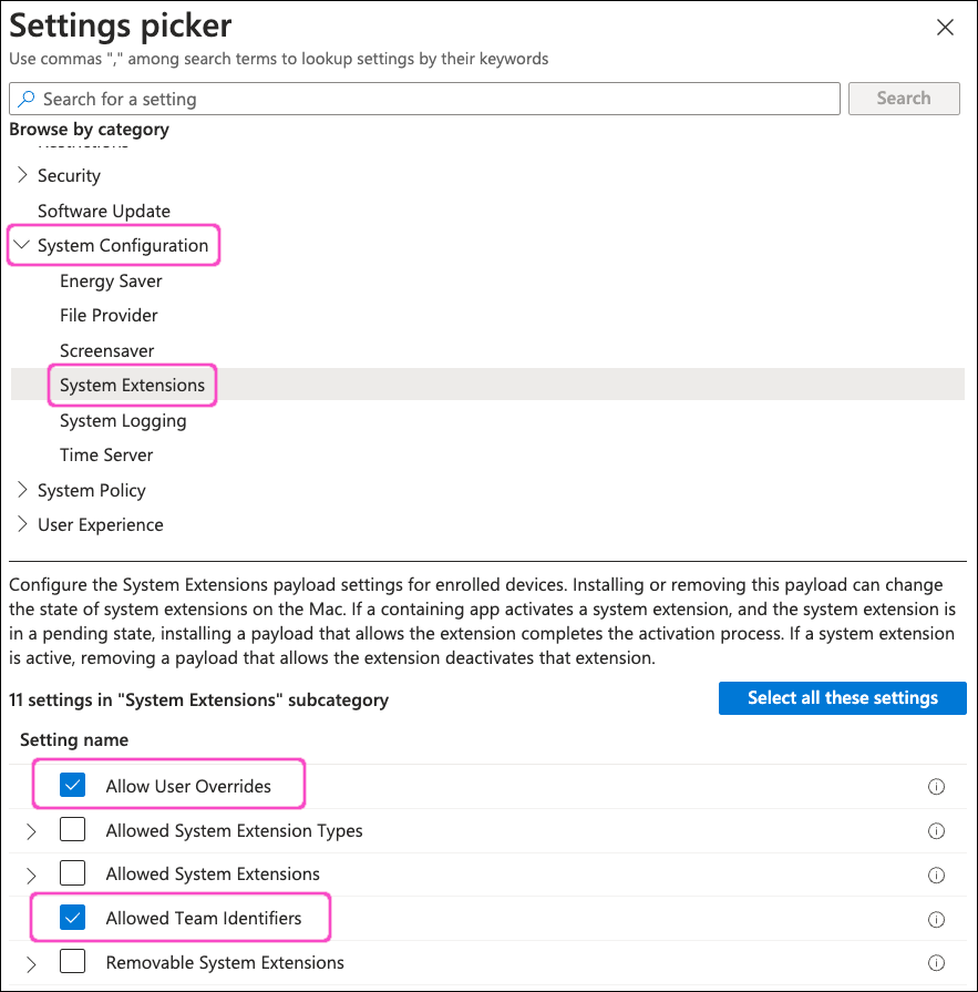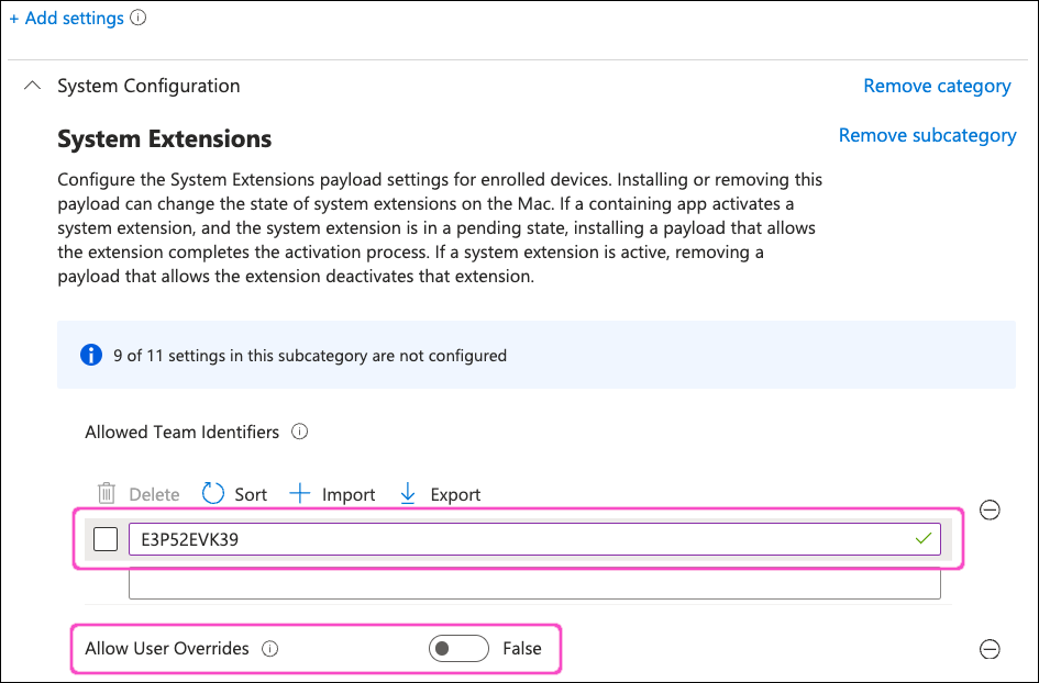 From the category list, select System Configurations > System Extensions. Then, select Allow User Overrides and Allowed Team Identifiers: