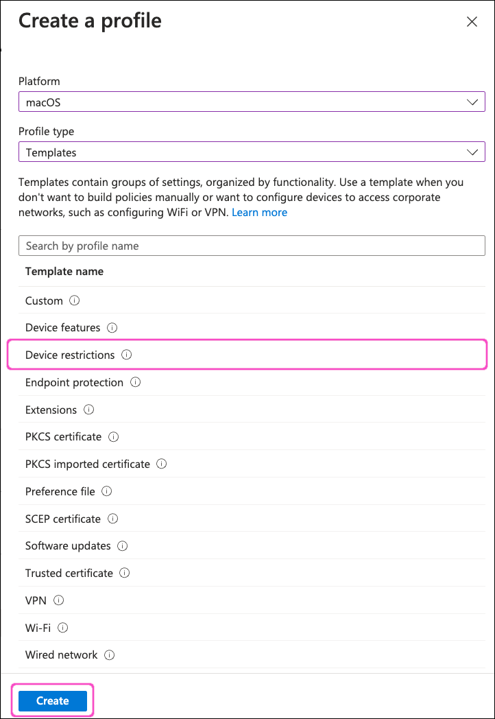 In the Platform dropdown, select macOS. Then, for Profile type, select Templates.
