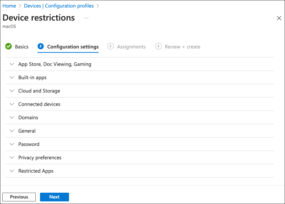 From the list of templates, select Device restrictions, then select Create:
