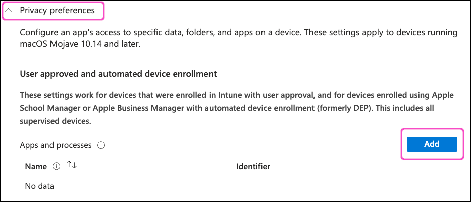 In the Privacy preferences section, select Add again to add a fourth row with the following new settings: