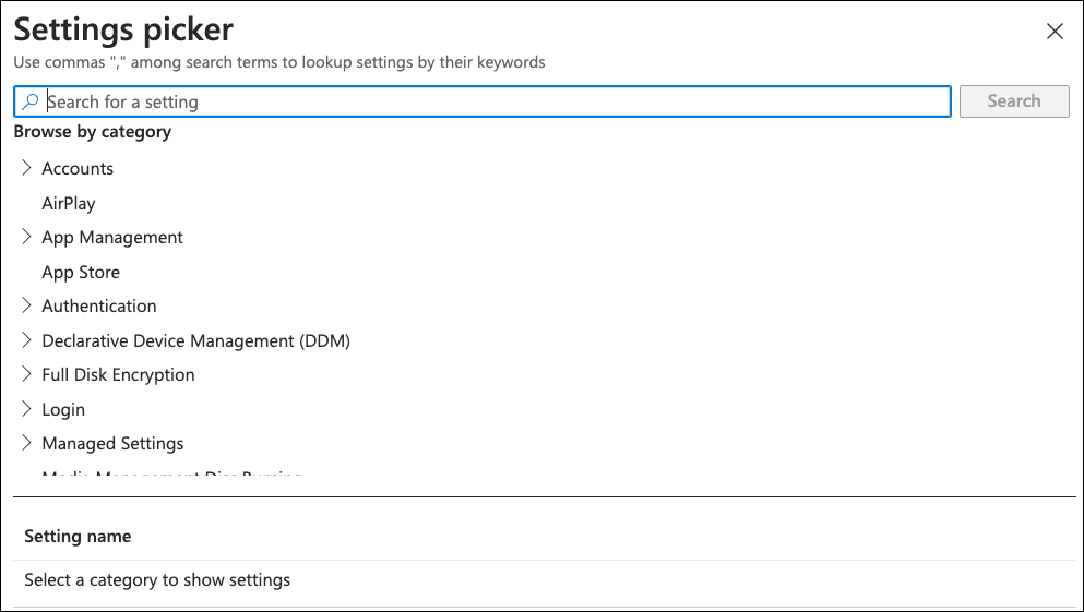 Intune displays the Settings picker dialog: