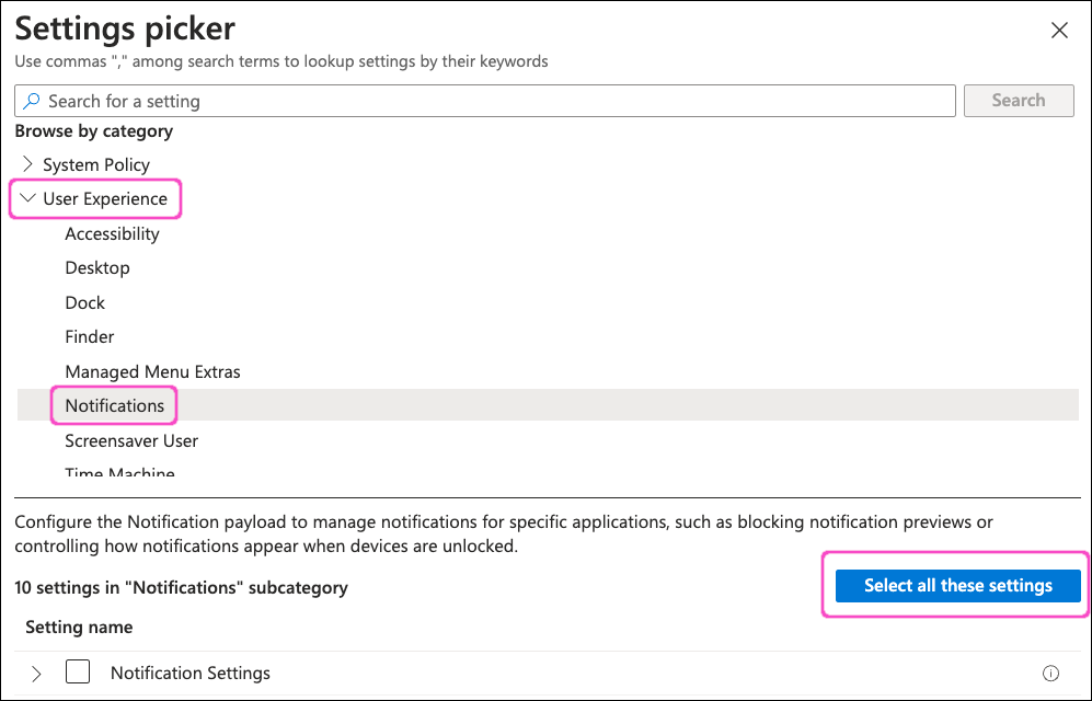 From the category list, select User Experience > Notifications. Then select Select all these settings: