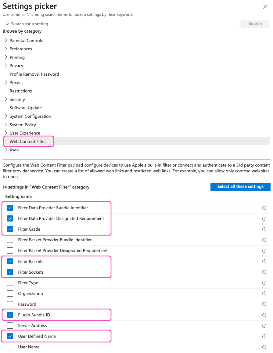 In the Web Content Filter section, enter the following settings: