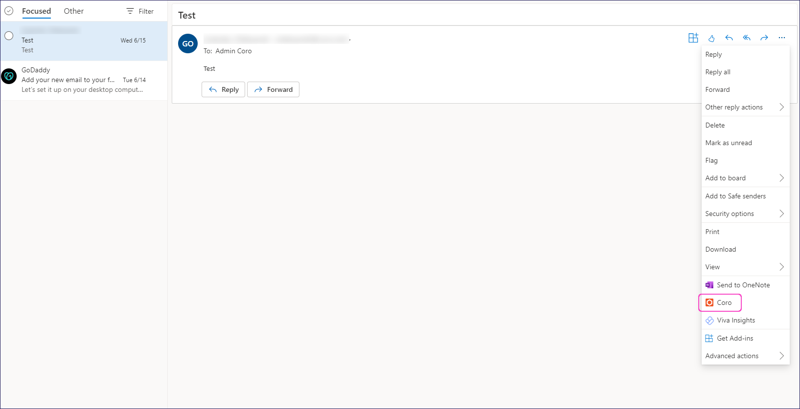 Users can access Coro through the email message menu: