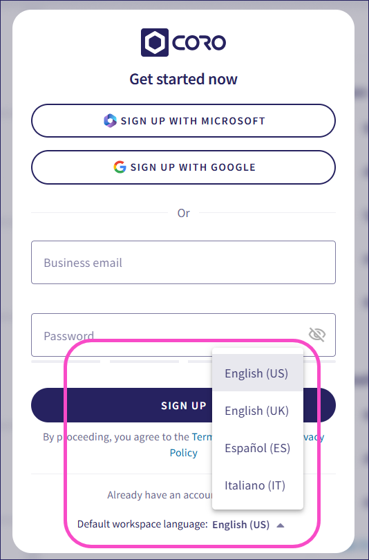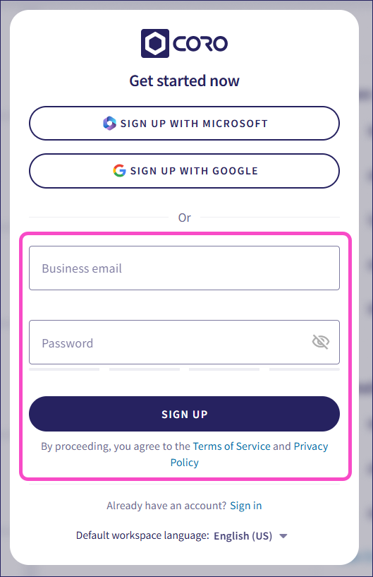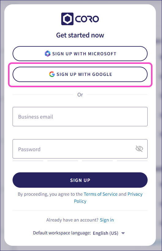 When you sign up for Coro, you gain access to a Coro workspace, a virtual environment that encapsulates all relevant information related to a customer's organization for an administrator or security operative (admin user). Each admin user accesses their workspace to connect to cloud applications, add protected users, and define settings and policies for their subscribed protection modules. Sign up and create a Coro workspace using: