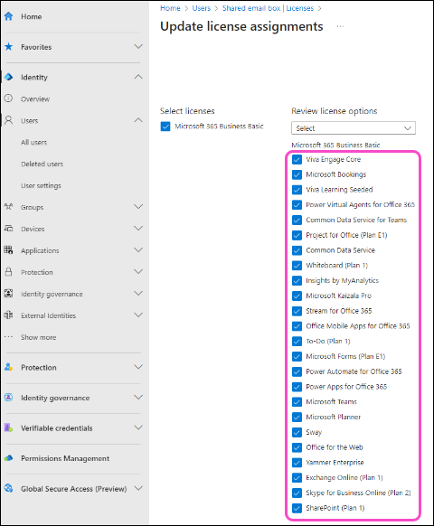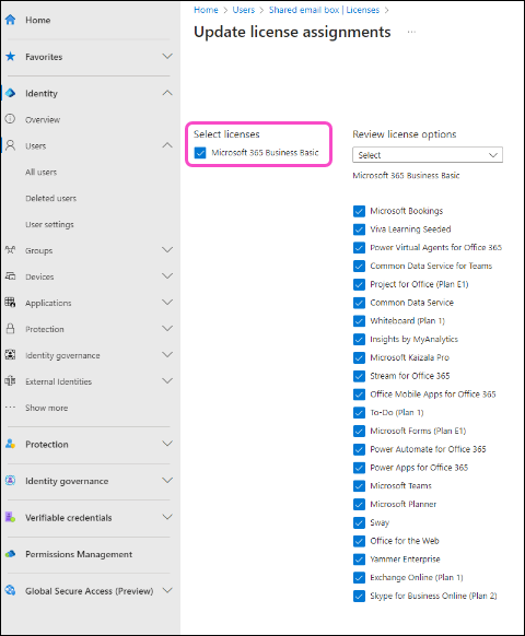Select the Microsoft 365 license options to assign to the shared mailbox: