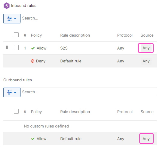 For both Inbound rules and Outbound rules, make sure Source is set to Any for the Allow policy. Leave the Deny policy at their default values:
