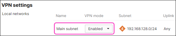 Local networks: Set VPN mode to "Enabled" for the Main subnet: