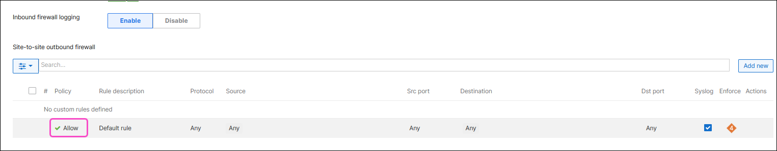 Site-to-site outbound firewall: Make sure the policy is set to "Allow":