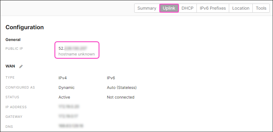 Select Uplink and note the PUBLIC IP address value: