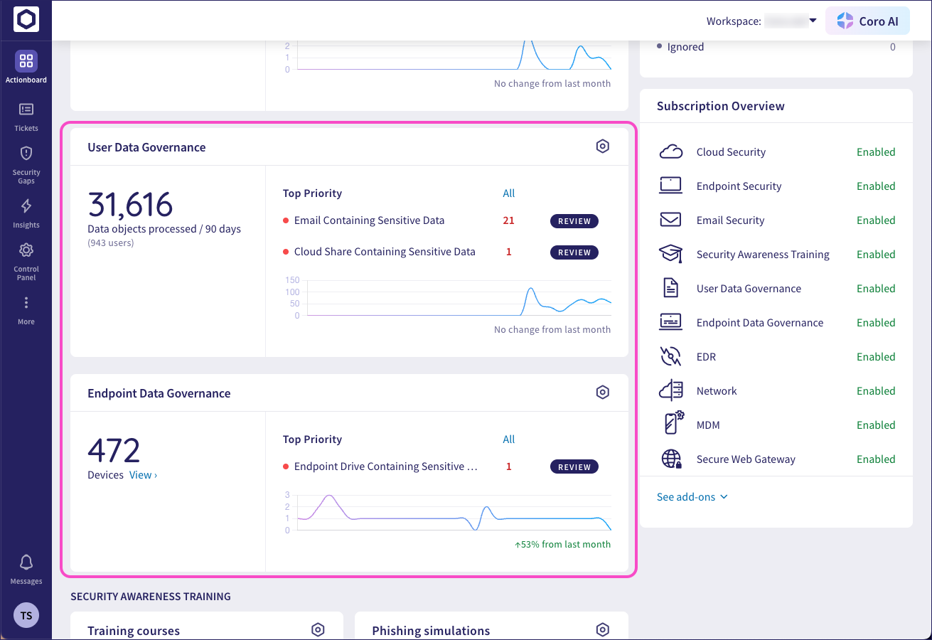 In the Coro Actionboard, you can view a summary of activity across your workspace. To observe an analysis of data protection and monitoring activity, use the User Data Governance and Endpoint Data Governance panels: