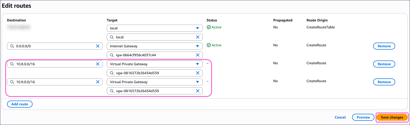 - Target: Select Virtual Private Gateway and then select your virtual private gateway.