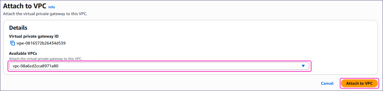 Select a VPC from the Available VPCs dropdown, and then select Attach to VPC:
