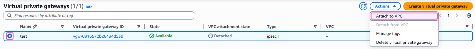 From the Virtual private gateways list, select the new VPG, and then select Actions > Attach to VPC:
