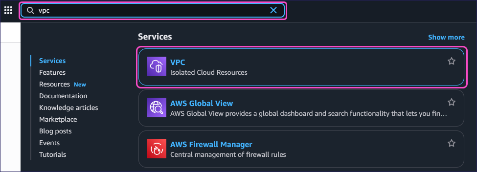 Enter vpc into the search field, and then select VPC from the Services section: