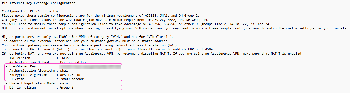 Note the following values under the #1: Internet Key Exchange Configuration section: