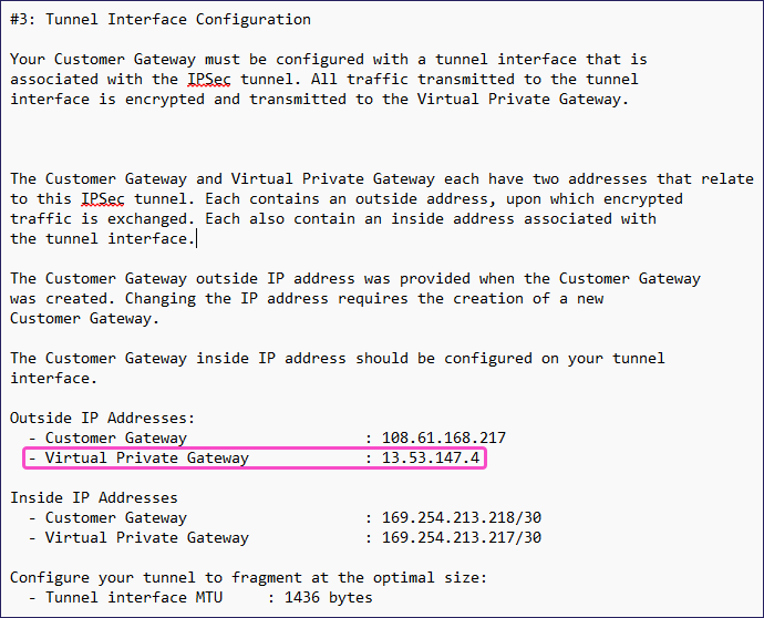 Note the Virtual Private Gateway value under the Outside IP Addresses subsection of the #3: Tunnel Interface Configuration section: