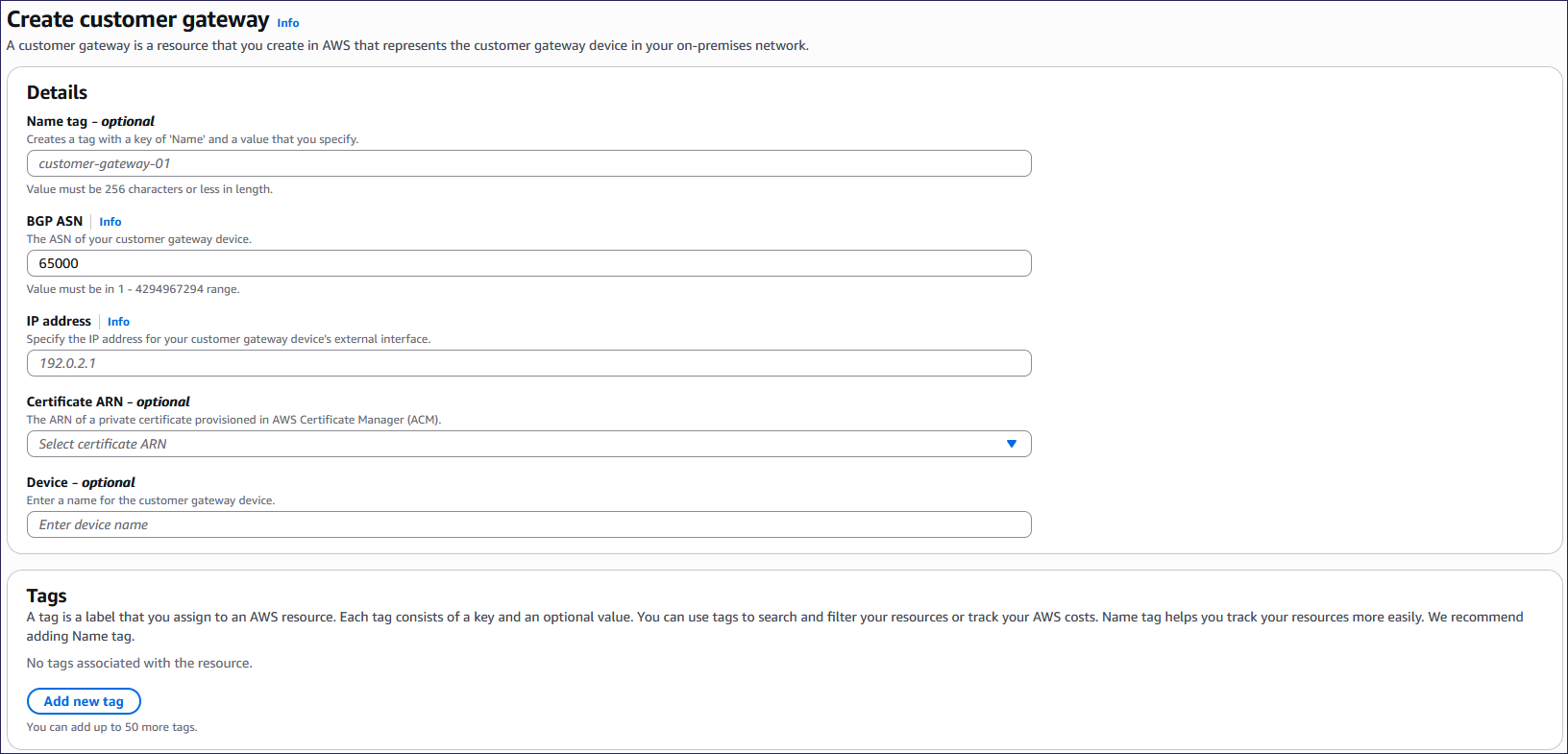 AWS displays the Create customer gateway page: