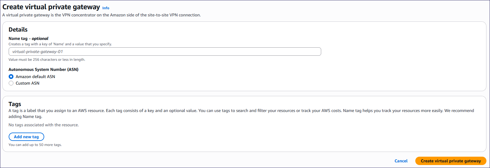 AWS displays the Create virtual private gateway page: