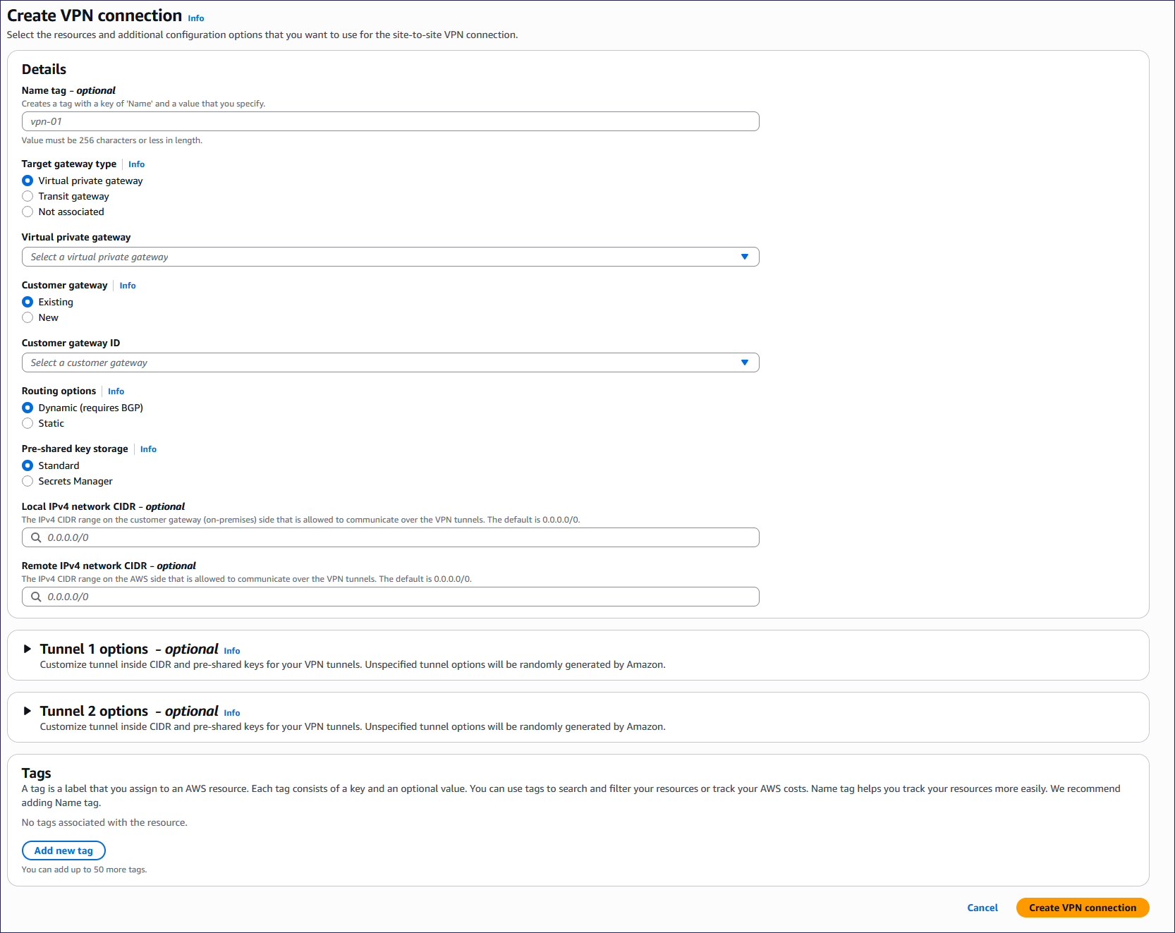Leave the Tunnel 1 options, Tunnel 2 options, and Tags sections empty.
