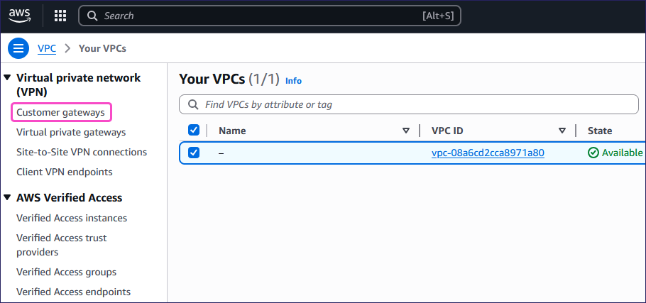 From the left pane, select Customer gateways from the Virtual private network (VPN) section: