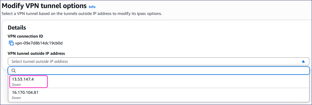 Select your VPN tunnel outside IP address from the VPN tunnel outside IP address dropdown: