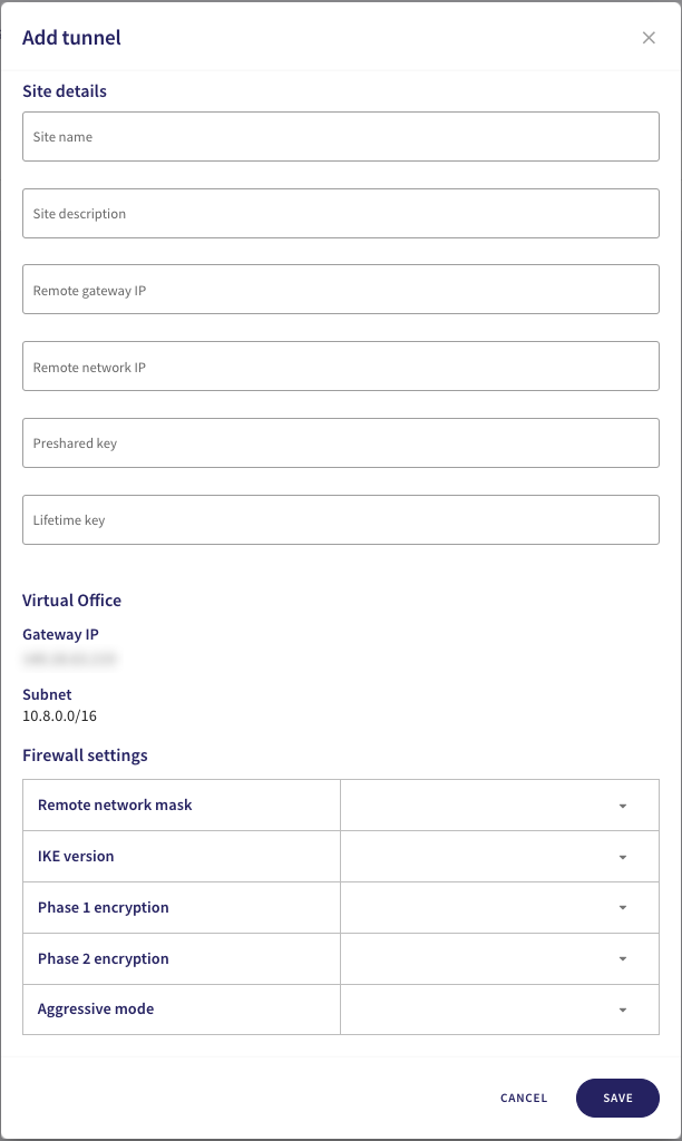Configure Coro with details of your site-to-site tunnel and firewall settings: