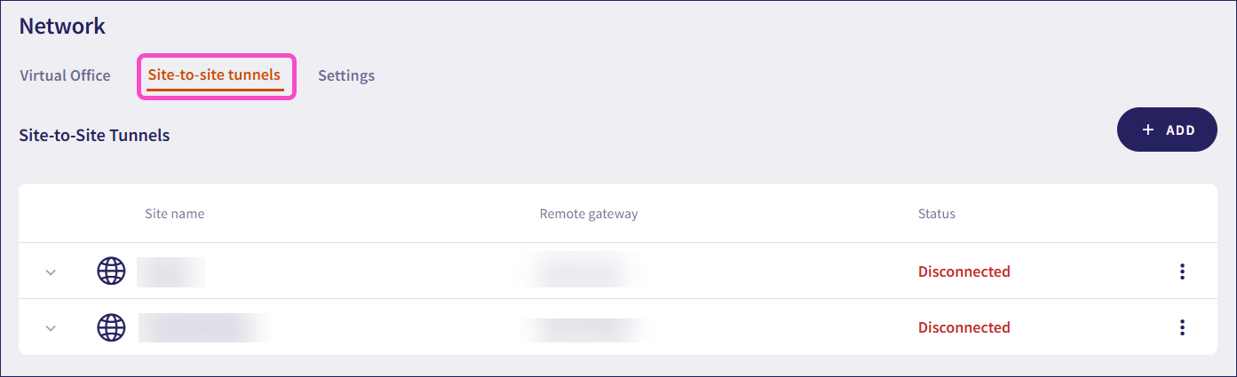 Select + ADD to create a new site-to-site tunnel.