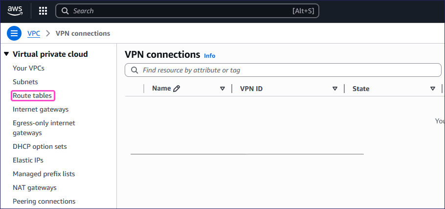 From the left pane, select Route tables from the Virtual private cloud section:
