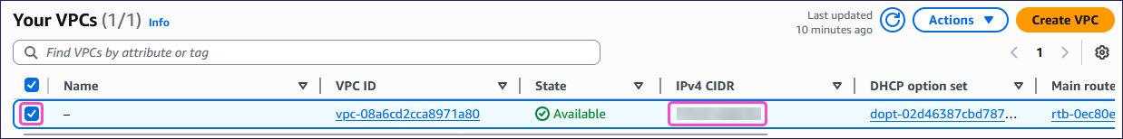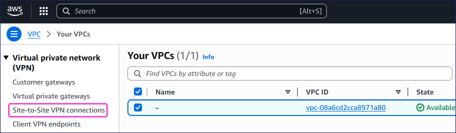 From the Your VPCs page, select the VPC that you want to use for the site-to-site VPN connection.