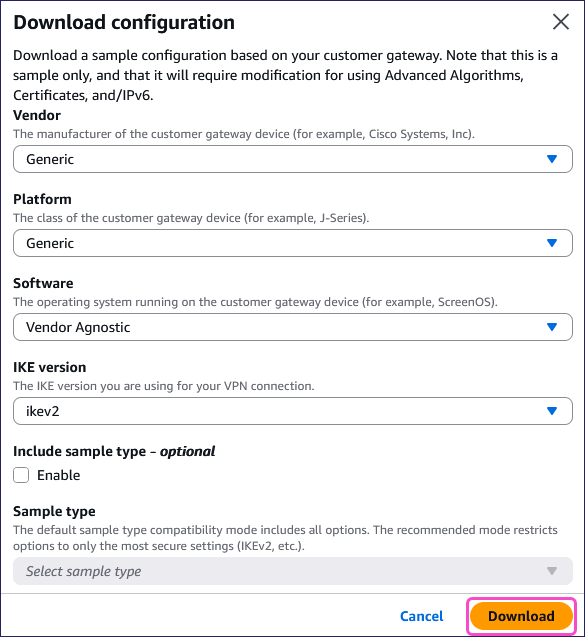 AWS displays the Download configuration dialog.