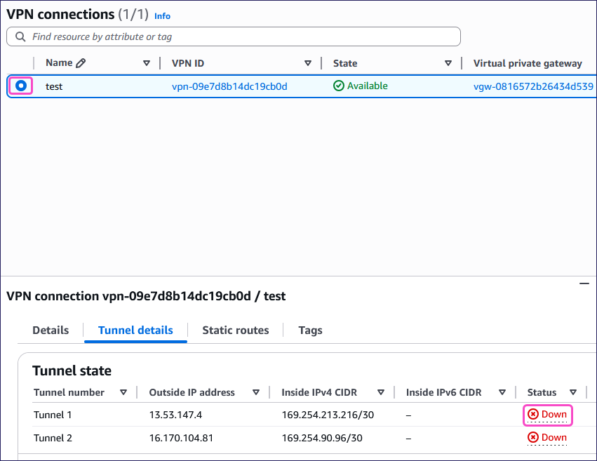 In the Tunnel state section, AWS displays the tunnel with a Down status: