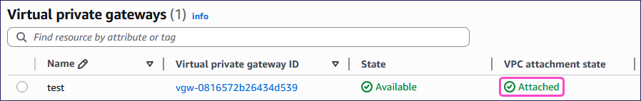 After AWS completes the process, the VPC attachment state column displays Attached: